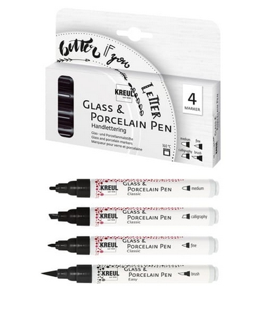 Wodna farba do porcelany w wygodnej formie pisaka. Pisaki do szkła i porcelany mają żywe, intensywne kolory. W zestawie zawarte są pisaki o różnych końcówkach, co pozwala na uzyskanie wielu różnych efektów. Zestaw idealny dla miłośników handletteringu jak i profesjonalnych kaligrafów. Farba ma dobrą siłę krycia, nie blaknie, nie zawiera rozpuszczalników. Oprócz porcelany, szkła można używać do zdobienia metalu i szkliwionej ceramiki.