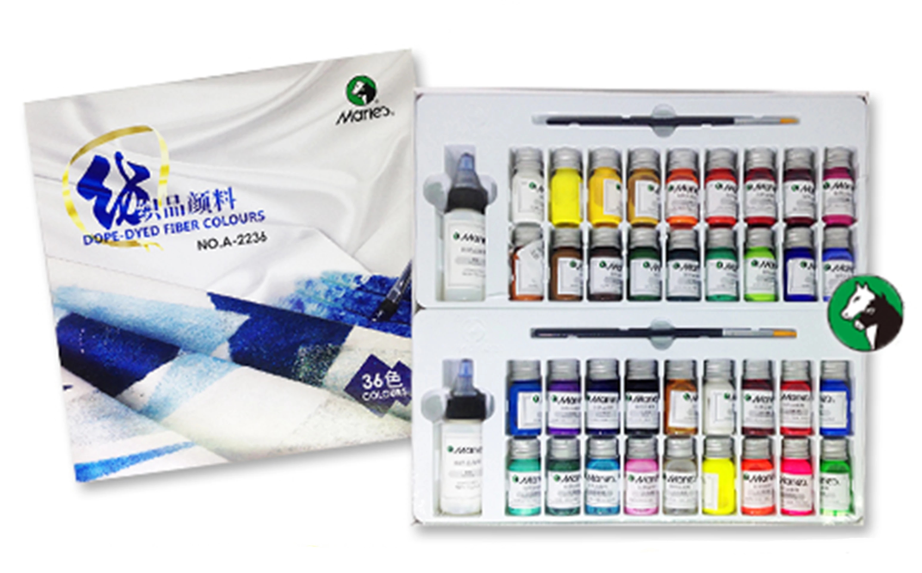 Zestaw składa się z 36 kolorów w słoikach o pojemności 10ml, dwóch mediów o pojemności 30ml oraz dwóch nylonowych pędzelków.